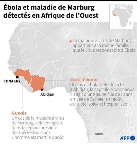 | Carte et données sur les deux cas d'Ebola et de maladie à virus de Marburg, détectés en Côte d'Ivoire et en Guinée. |