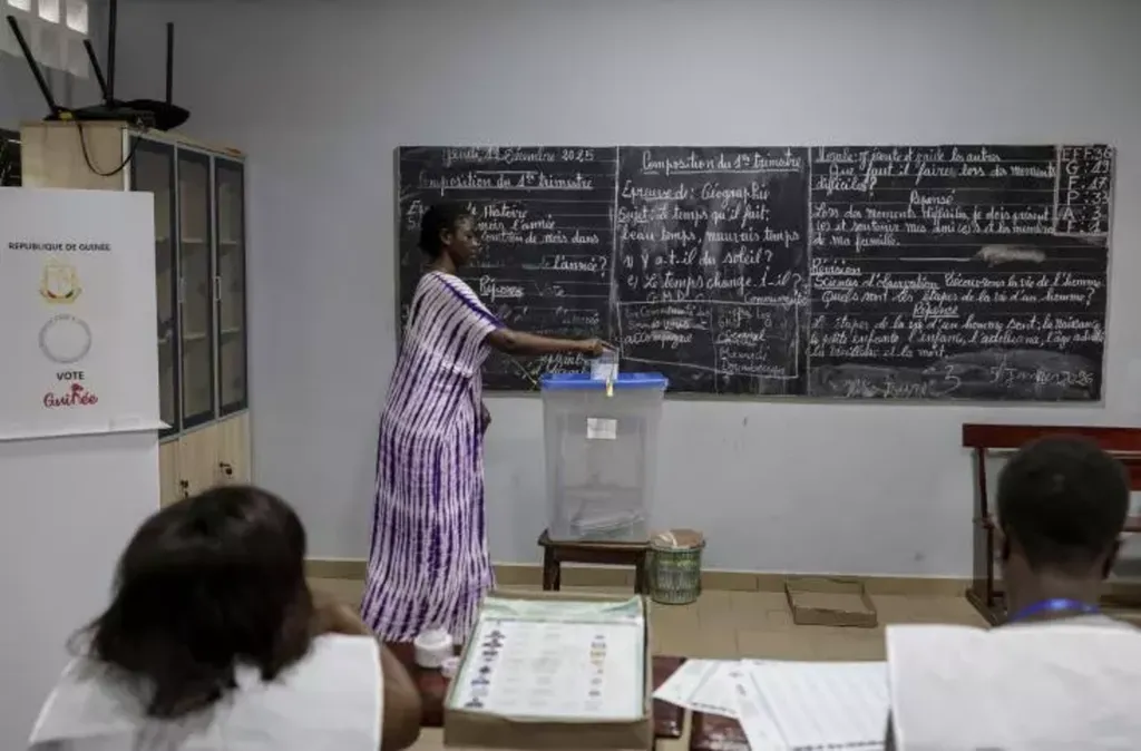 | Un électeur dépose son bulletin dans l'urne dans un bureau de vote à Conakry, le 28 décembre 2025, lors de l'élection présidentielle guinéenne. |