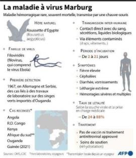 "Marburg, qui appartient à la même famille qu'Ebola, est transmis aux humains par les roussettes (des chauves-souris) et se propage parmi les humains par contact direct avec les fluides corporels des personnes, des surfaces et des matériaux infectés", selon le texte. Bien qu'il n'existe pas de vaccins ou de traitements antiviraux approuvés pour traiter le virus, la réhydratation par voie orale ou intraveineuse et le traitement des symptômes spécifiques améliorent les taux de survie.