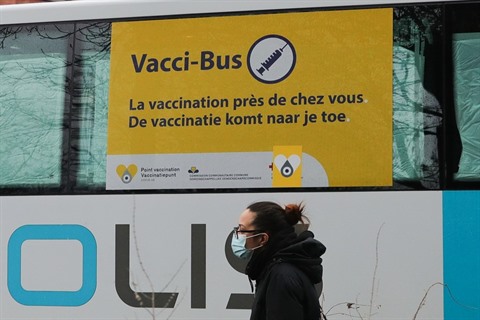 | Une femme passe devant un bus de vaccination à Bruxelles, en Belgique, le 30 novembre. |