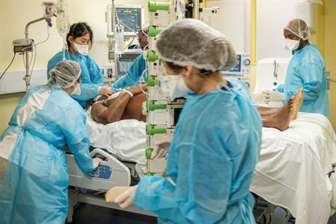| Des membres du personnel hospitalier s'occupent d'un patient malade du COVID-19 en soins intensifs à Cayenne le 24 septembre 2021. |