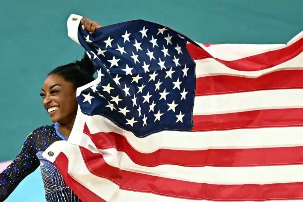 | La gymnaste américaine Simone Biles célèbre sa victoire en finale du concours général individuel des Jeux olympiques à l'Arena de Bercy à Paris, le 1er août. |