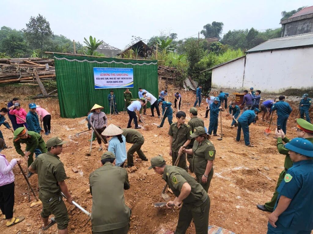 | Des soldats et habitants soutiennent la reconstruction des maisons précaires et délabrées pour les populations ethniques minoritaires dans le district de Quang Binh, province de Hà Giang. |