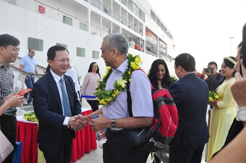 | Le vice-président du Comité populaire de la province de Quang Ninh, Cao Tuong Huy (2e, gauche) offre des cadeaux à un touriste étranger du navire Silver Shadow dans le port international d'Ha Long. |