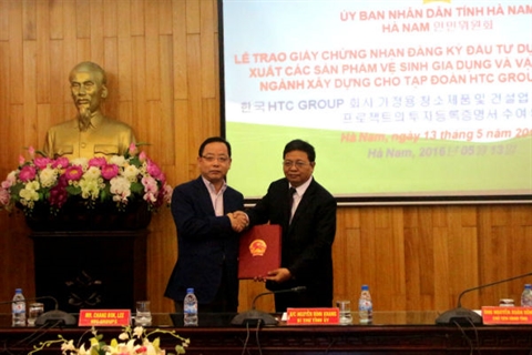 | Le président du Comité populaire de Hà Nam, Nguyên Xuân Dông (droite); remet le 13 mai la licence d'investissement au président du HTC Group, Lee Chang Bok. |