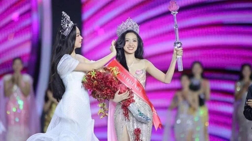 | Miss Vietnam 2022 Huynh Thi Thanh Thuy (gauche) couronne la nouvelle Miss Vietnam 2024 Hà Trúc Linh, lors de la grande finale à Huê, dans la soirée du 27 juin. |