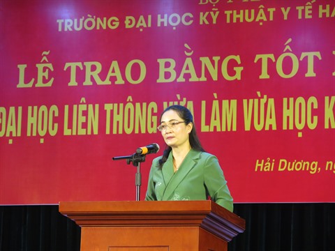| La directrice de l’Université de technique médicale de Hai Duong, Dinh Thi Diêu Hang, s’exprime lors de l’événement, le 6 août à Hai Duong (Nord). |
