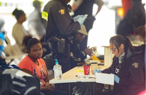 | Des réfugiés sont accueillis par les autorités après avoir traversé la frontière entre les États-Unis et le Canada près d'Hemmingford, au Québec, le 6 août |