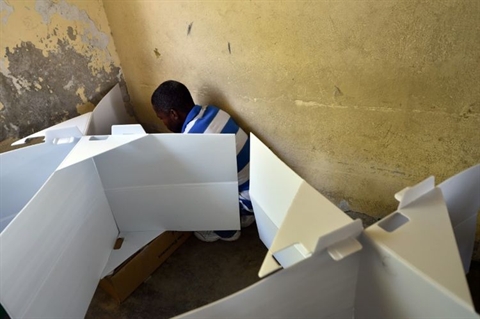 | Un homme dans un bureau de vote à Port-au-Prince en Haïti, le 9 août. |