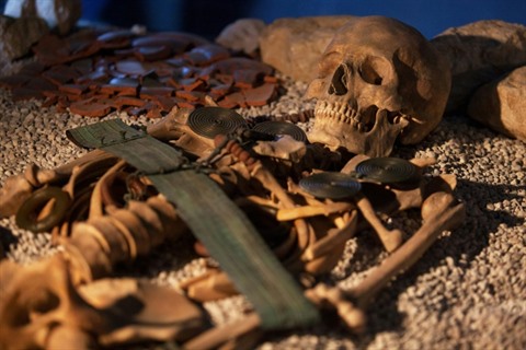 | Une nécropole sans équivalent a été découverte à Hallstatt en Autriche au milieu du XIXe siècle. Photo des ossements d'un mineur, le 16 août. |