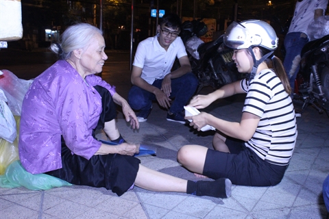 Après la gare, le groupe de Hân se dirige vers la station de bus Giap Bat, puis le pont Chuong Duong, des distributeurs automatiques de billets. Vers 01h00 du matin, le groupe se sépare et Hân remonte seule la rue Bà Triêu. «J’apporte cette dernière portion à une vieille femme qui dort devant le centre commercial Vincom», explique-t-elle. «Aujourd’hui c’est mardi. Je savais que tu viendrais. Je t’attendais», dit la vieille dame avec un large sourire. Hân lui répond : «Le riz est encore tiède. Mangez-le et après nous discuterons un peu».