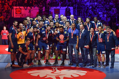 | L'équipe de France et son entraîneur Didier Dinart médaillés de bronze à l'Euro 2018, à Zagreb, le 28 janvier. |