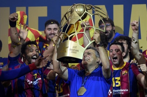 | L'entraîneur de Barcelone, Xavier Pascual Fuertes (centre), brandit le trophée de la Ligue des champions après la victoire en finale contre Aalborg, à Cologne, le 13 juin. |