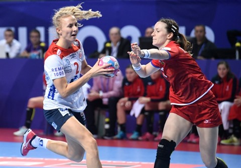 | La Norvégienne Henny Ella Reistad attaque la Tchèque Helena Rysankova dans le groupe D de l'Euro à Brest, le 3 décembre. |