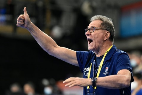 | Le sélectionneur des Bleues Olivier Krumbholz lors du match contre le Danemark au Mondial à Granollers, le 17 décembre 2021. |
