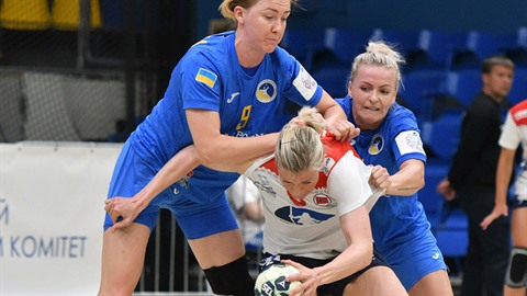 | Les joueuses ukrainiennes Yuliia Snopova et Anna Redka serrent leur défense contre la Norvégienne Heidi Loke en qualification pour l'Euro le 30 mai 2018 à Kiev. |