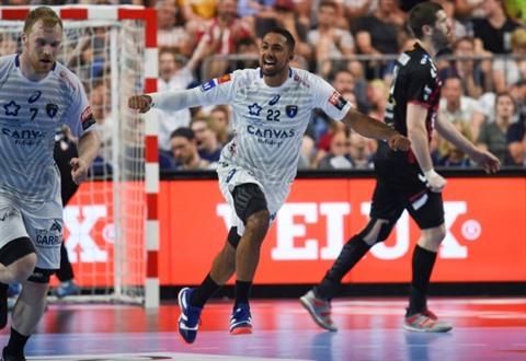 | Melvyn Richardson (centre) après un but pour Montpellier en demi-finale de Ligue des champions face à Vardar, le 26 mai à Cologne. |
