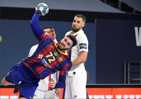 | Le pivot français de Barcelone, Ludovic Fabregas (1er à gauche) lors de la demi-finale du Final Four de la Ligue des Champions, le 28 décembre 2020. |
