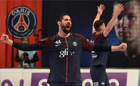 | La joie du demi-centre du Paris Saint-Germain, Nikola Karabatic, après un but marqué contre le club polonais PGE Vive Kielce, lors du quart de finale de la la Ligue des Champions, le 28 avril 2018, à Paris. |