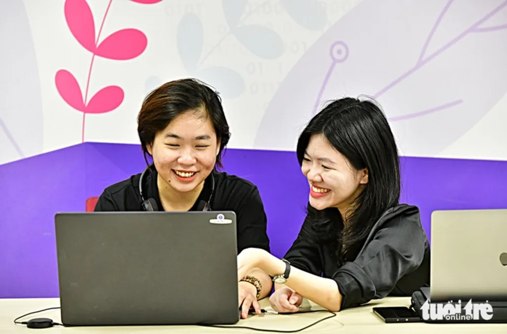 | Lan Anh (à gauche) avance constamment avec l’appui de ses collègues. |
