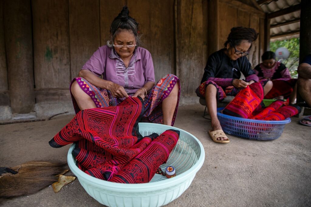 | Les femmes H'mông brodent chaque matin, devant leur maison. |