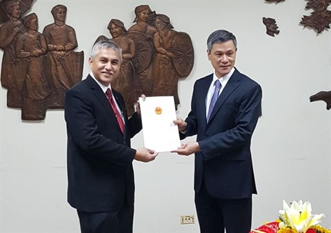 | L'assistant du ministre vietnamien des AE, chef du Département consulaire du ministère des AE, Nguyên Minh Vu (droite), remet la lettre d'approbation consulaire à l'Indonésien Hanif Salim. |