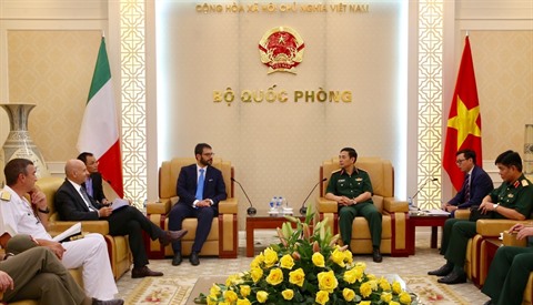 | Le général Phan Van Giang, chef de l’état-major général de l’Armée populaire vietnamienne et vice-ministre de la Défense (droite), reçoit le secrétaire d’État italien à la Défense, Angelo Tofalo. |