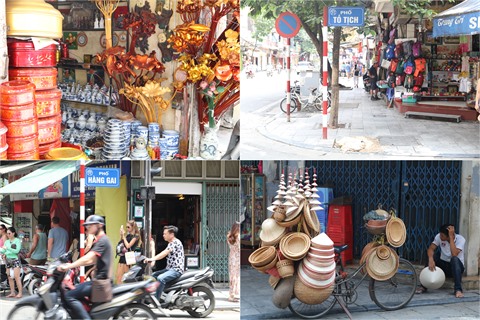 Situé dans l’arrondissement de Hoàn Kiêm et couvrant 100 ha, le Vieux quartier de Hanoï comporte 76 rues, dont environ 47 ont conservé leur dénomination ancienne qui commence par le mot Hàng, signifiant «marchandises». Chaque quartier porte les traces de son histoire. Les noms des rues rappellent toujours les marchandises qui y étaient produites ou qui le sont toujours : la rue Hàng Dào (rue des teinturiers de la soie rouge), la rue Hàng Duong (la rue du sucre), la rue Hàng Thiêc (rue des Ferblantiers), la rue Hàng Ma (rue des objets votifs)...