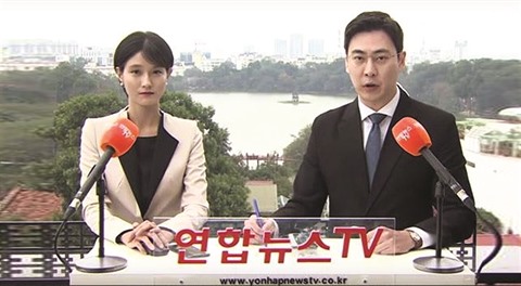 L’agence de presse sud-coréenne Yonhap a placé son plateau télé sur la terrasse d’un immeuble donnant sur le lac Hoàn Kiêm pour son programme spécial retransmis en direct.