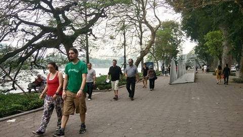 | Touristes étrangers au bord du lac Hoàn Kiêm, au cœur de Hanoï. |