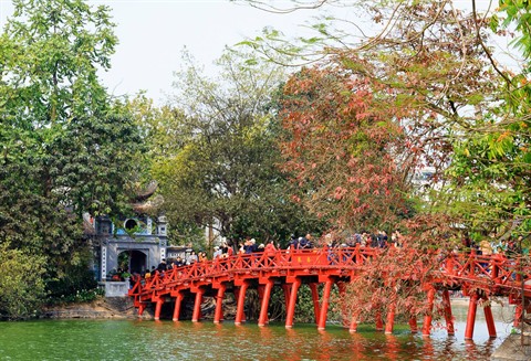 | Le pont Thê Huc menant au Temple Ngoc Son, au cœur de la capitale, est une destination très prisée des touristes. |