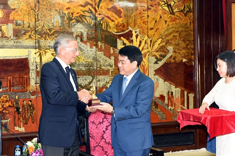 | Le président du Comité populaire de Hanoi, Nguyên Duc Chung (droite), et le secrétaire d’État auprès du ministre des Affaires étrangères et du Développement international, chargé du Développement et de la Francophonie, André Vallini. |
