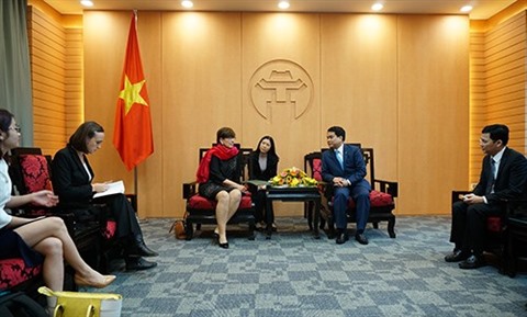| Le président du Comité populaire de Hanoï, Nguyên Duc Chung, reçoit l'ambassadrice de Belgique, Jehanne Roccas. |