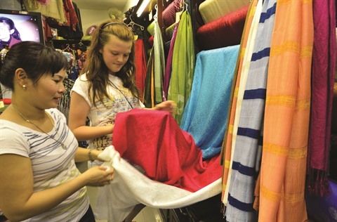 | Des touristes étrangers au village de Van Phuc, en banlieue de Hanoï, spécialisé dans les soieries traditionnelles. |