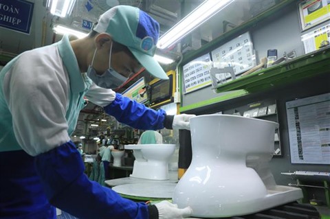 | Une chaîne de production de la SARL ToTo Vietnam dans le parc industriel Thang Long, à Hanoï. |