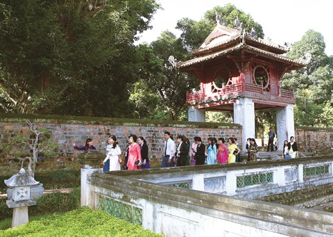 | Des visiteurs au Temple de la Littérature, à Hanoï. |