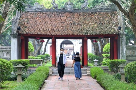 | Touristes visitant le Temple de la Littérature à Hanoï. |