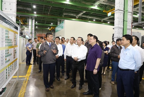 | Le secrétaire du Comité du Parti de Hanoï, Vuong Dinh Huê (chemise violet), lors d'une visite dans la zone industrielle (ZI) de Hoà Lac, en juillet 2020. |