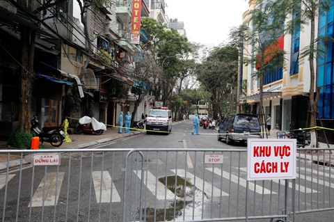 | Dans une rue en quarantaine à Hanoï, où se trouve la maison d'un patient infecté par le COVID-19, le 7 mars. |