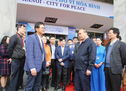 | Le Premier ministre Nguyên Xuân Phuc (2e à droite) s'est rendu sur place dans le Centre international de presse au service du IIe Sommet États-Unis - RPDC, le 25 février. |