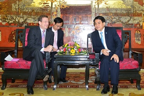 | Le président du Comité populaire de Hanoï, Nguyên Duc Chung (droite), et l’ambassadeur français au Vietnam, Bertrand Lortholary, le 17 octobre à Hanoï. |