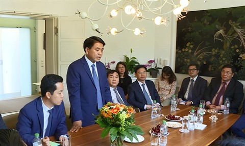| Le président du Comité populaire de Hanoï, Nguyên Duc Chung (debout), s'exprime le 19 juin au consulat général du Vietnam à Francfort. |