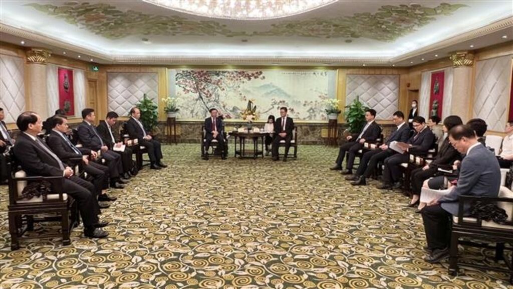 | Rencontre entre Dinh Tiên Dung, membre du Bureau politique du Parti communiste du Vietnam (PCV), secrétaire du Comité du PCV de Hanoï (gauche) et le secrétaire du Comité du Parti communiste chinois de Guangzhou, maire de la ville chinoise, Guo Yonghang. |