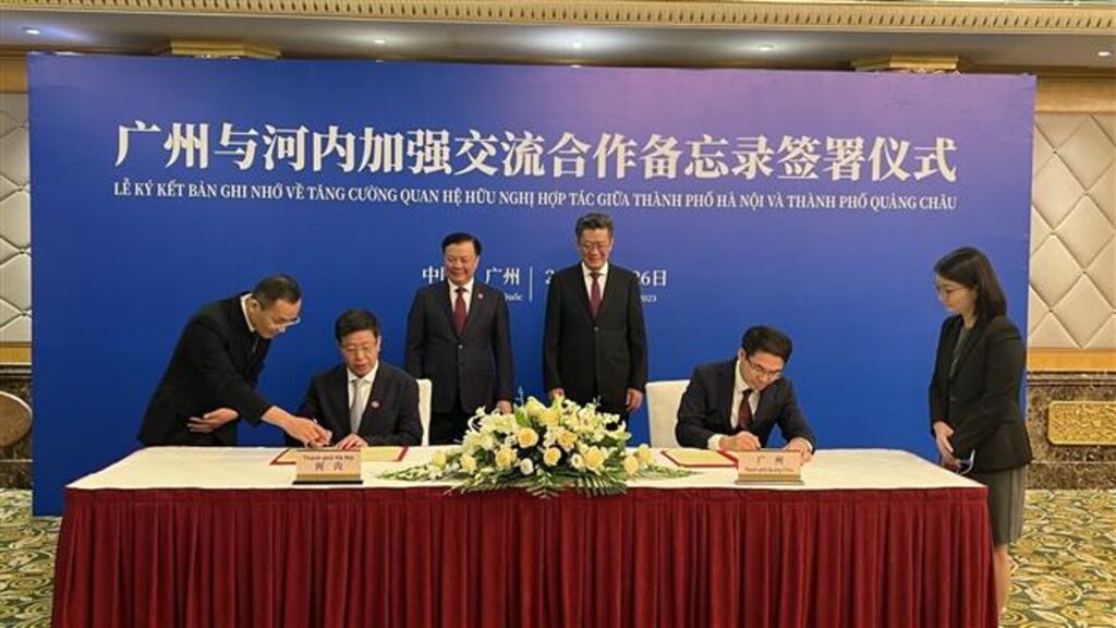 | Cérémonie de signature d'un mémorandum de coopération entre le Comité populaire de Hanoï et l’administration de la ville de Guangzhou, province chinoise du Guangdong. |