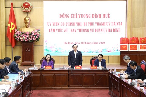 Lors d’une séance de travail avec la permanence du Comité du Parti du district de Ba Dinh (Hanoï), le 10 mars, le secrétaire du Comité municipal du Parti, Vuong Dinh Huê, a déclaré apprécier les efforts du district de Ba Dinh dans la prévention et la lutte contre l’épidémie de COVID-19.