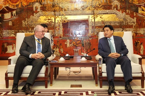 | Le président du Comité populaire municipal Nguyên Duc Chung (droite) et l’ambassadeur belge Paul Jansen lors de leur rencontre, le 14 février à Hanoï. |