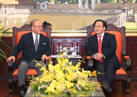 | Hoàng Trung Hai (droite) et Tsutomu Takebe, le 9 mars à Hanoi |