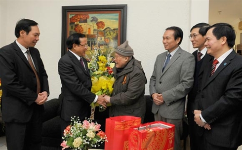 | Le secrétaire de l'organisation municipale du Parti de Hanoi, Pham Quang Nghi (2e, gauche), formule ses meilleurs vœux du Têt à l'ancien dirigeant de la ville, Nguyên Van Trân. |