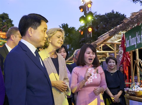 | Le président du Comité populaire de Hanoï, Nguyên Duc Chung (gauche), présente les plats traditionnels vietnamiens à la présidente du Conseil régional d’Île-de-France, Valérie Pécresse (centre). |
