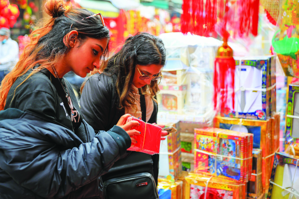 | Deux touristes étrangères achetant des enveloppes rouges "lì xì" (étrennes). |